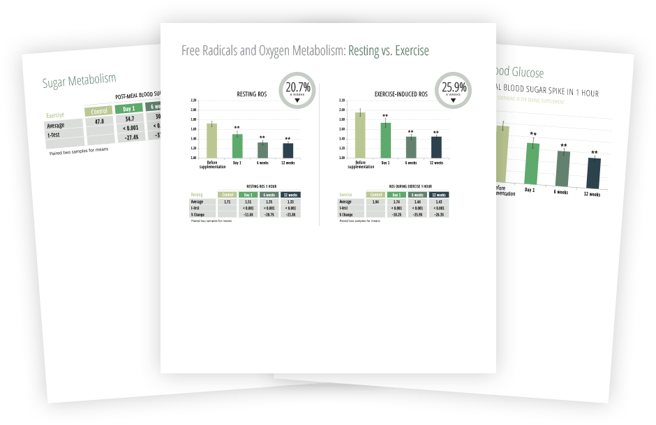The amount of free radicals in the blood during rest and then during exercise was tested. In the research, free radicals were measured as Reactive Oxygen Species, or ROS. No other supplements we know of have produced similar results.